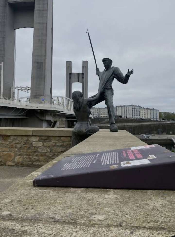 Die Stadt Brest in der Bretagne ist vor allem für ihren großen Hafen und ihre Sehenswürdigkeiten bekannt. Zu den Sehenswürdigkeiten gehören das Château de Brest mit dem Marine-Museum, die große Hubbrücke Pont de Recouvrance und die historische Straße Rue Saint-Malo. Am Hafen steht außerdem die Statue Fanny de Laninon et Jean Quéméneur, die an eine bretonische Liebesgeschichte erinnert: Der Seemann Jean musste zur See fahren und seine Geliebte Fanny wartete auf seine Rückkehr. Dort haben wir auch ein kleines Theaterstück zu dieser Geschichte aufgeführt. Besonders interessant fanden wir die Statue und die Geschichte dahinter. Die Stadt war sehr lebendig und voller Menschen, was uns besonders gefallen hat, und auch die Atmosphäre am Hafen sowie der Blick auf das Meer haben uns sehr gut gefallen.