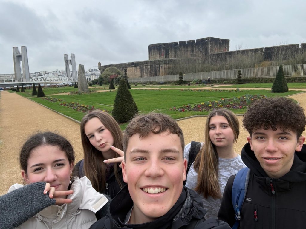 Am 9. März 2026 fuhren wir um 8.35 Uhr los, und erreichten um 10.15Uhr Brest. Unsere Stadtrallye startete am Busbahnhof und führte durch den Jardin Alphonse Juin, einem schönen Park. Im Garten war die Aufgabe ein kreatives Foto zu machen. Danach führte uns ein Weg an der Küste direkt zu einem Amerikanischen Denkmal dem Cours Dajot. Dort mussten wir ein Foto machen auf dem das ganze Monument zu sehen ist, da das Denkmal sehr hoch ist. Unser Weg führte uns am Château de Brest vorbei, über die beeindruckende Pont de Recouvrance zu der Statue von Fanny und Jean, die Protagonisten eines bretonischen Stückes. Die Geschichte der beiden hat uns besonders gut gefallen da wir diese extrem süß fanden, wenn ihr genaueres darüber erfahren möchtet könnt ihr den anderen Blogbeitrag zu Brest durchlesen.